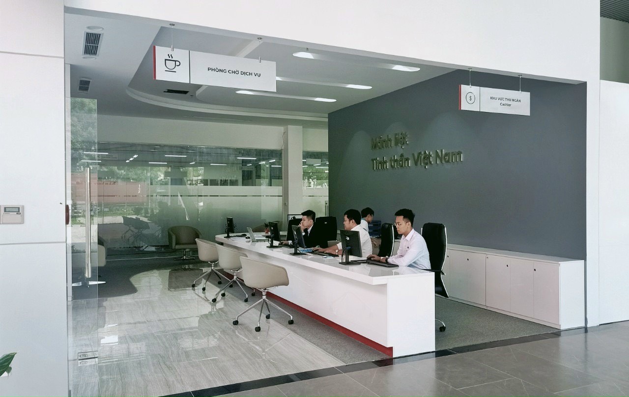 Phòng tiếp khách có diện tích khoảng 150m2 với nội thất da được nhập khẩu hoàn toàn từ Châu Âu của hãng Chateau d’Ax - là thương hiệu Sofa da thật lớn thứ hai Châu Âu, Chateau d’Ax. Đây là thương hiệu Sofa da đã có lịch sử hơn 70 năm phục vụ cho giới thượng lưu trên toàn thế giới., Những chiếc ghế được làm tỉ mỉ từ tay những người thợ thủ công lành nghề . Những loại bê mềm được lựa chọn riêng và với công thuộc da hàng đầu thế giới .Điều đó mang lại sự trải nghiệm hoàn toàn mới và đăng cấp 5 sao, là nơi khách hàng được đón tiếp, cũng là nơi những chủ xe VinFast có thể ngồi nghỉ ngơi vói thưởng thức những ly nước mát được pha chế bởi bàn tay của những bartender nổi tiếng trong quá trình mang xe tới sửa chữa. Đội ngũ nhiệt tình luôn sẵn sàng lắng nghe, thấu hiểu và tư vấn, giải quyết mọi thắc mắc của quý khách